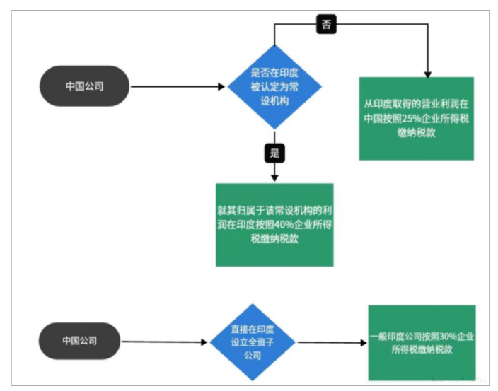 根据税收协定,如果中国企业在印度设立了常设机构,需在印度缴纳40%的企业所得税税款。