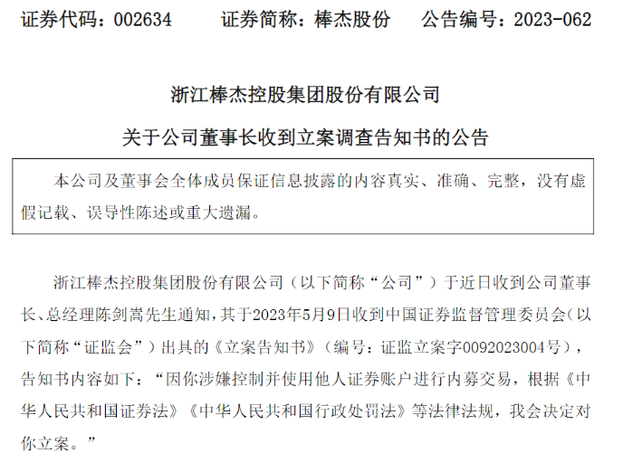 5月10日,棒杰股份公告称,公司于近日收到董事长、总经理陈剑嵩的通知,因涉嫌控制并使用他人证券账户进行内幕交易,中国证监会决定对陈剑嵩立案调查。