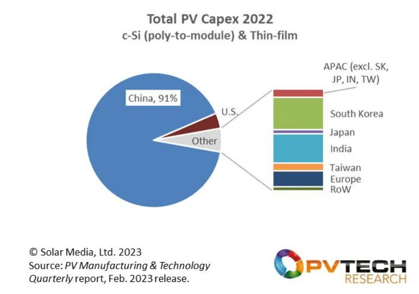 上面的饼图描绘的画面胜过千言万语。中国公司占2022年行业总支出的91%,只有First Solar的薄膜为外部世界带来了重要的、中国以外的希望。