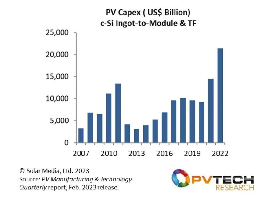 2022年,太阳能光伏制造厂的资本支出超过270亿美元(约合超1871亿元),创下历史新高。