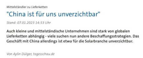 而根据德意志银行提供的数据,超过三分之一的中小型企业的供应链十分依赖中国。中国作为贝利特光伏企业的贸易伙伴也是必不可少的。瓦尔奇警告道,如果没有中国提供的核心部件,该集团将无法建造和开发太阳能工厂。