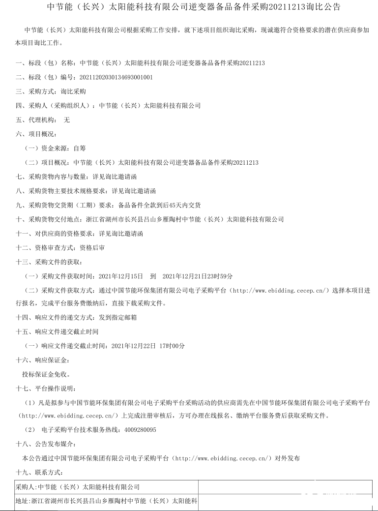 招标 | 中节能(长兴)太阳能科技有限公司逆变器备品备件采购20211213采购公告