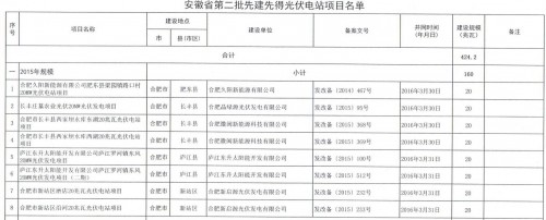 国际能源网讯:记者获悉,近日安徽省下达《关于进一步加强光伏电站项目开发管理的通知》(皖能源新能〔2015〕26号)和《关于完善“先建先得”分布式光伏电站管理的通知》(皖能源新能〔2016〕13号)的通知,该通知明确按并网先后顺序,将安徽省2015年结余和2016年部分新增建设规模424.2MW,配置给合肥久阳新能源有限公司肥东县梁园镇路口村20MW等23个光伏电站项目。本次未配置规模指标、且已公示并网的先建先得项目,将从2016年国家追加规模、未按期建成中标项目规模和2017年建设规模等指标中,按并网先后顺序统筹安排。