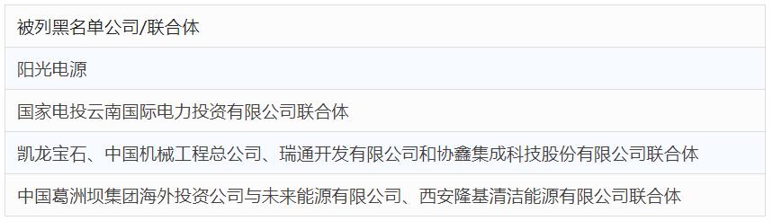 《伊洛瓦底》记者看到的供电企业的一封公函显示,被列入黑名单的公司包括阳光电源(Sungrow Power Supply Co,)、国家电投云南国际电力投资有限公司联合体(Consortium of SPIC Yunnan InternationalPower Investment Co,)、凯龙宝石(Khaing Lon Gem)、中国机械工程总公司(China Machinery Engineering Corporation)、瑞通开发有限公司和协鑫集成科技股份有限公司联合体(Consortium of Shwe Taung Development Cou0026 GCL System Integration Technology),中国葛洲坝集团海外投资公司与未来能源有限公司、西安隆基清洁能源有限公司联合体(Consortium of China Gezhouba Group Oversea Investment Company andFuture Energy Company Limited and XI’an LonGi Clean Energy Company)。