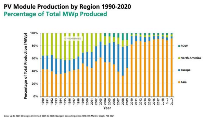 尽管欧洲仍是全球最大光伏市场之一,但其光伏制造业在十年前因迅速崛起的亚洲竞争对手而陷入停滞。以全球组件市场为例,上述报告显示,中国占比67%,整个亚洲地区占比为95%。在将光伏发电从一个昂贵电源发展为具备成本竞争力的主流清洁能源的过程中,中国制造功不可没。2021年,中国光伏组件产量连续15年位居全球首位。