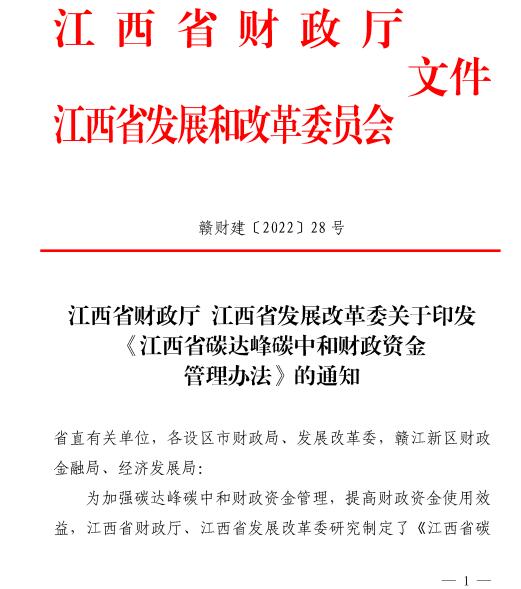 8月15日,江西省人民政府 江西省财政厅 江西省发改委印发《江西省碳达峰碳中和财政资金管理办法》的通知,通知指出,对于引导促进各地统筹推进碳达峰碳中和工作的支持事项,主要采取因素法分配,由各地按要求统筹确定具体支持事项或项目。测算因素为单位地区生产总值能源消耗降低目标完成比例、新能源发电量占本区域全社会用电量比重、地方财政困难程度和绩效评价,权重分别为40%、30%、15%、15%.省财政厅会同省发展改革委可结合年度工作重点确定和调整上述分配因素和权重,单个因素权重的调整幅度不超过20%,绩效评价因素权重不低于10%。