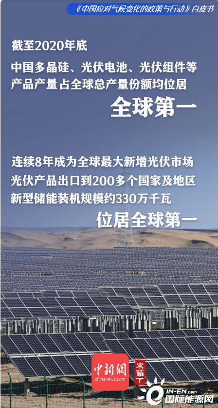 截至2020年底,中国多晶硅、光伏电池、光伏组件等产品产量占全球总产量份额均位居全球第一,连续8年成为全球最大新增光伏市场;光伏产品出口到200多个国家及地区,降低了全球清洁能源使用成本;新型储能装机规模约330万千瓦,位居全球第一。