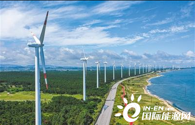 山东荣成北部海湾附近,风力发电机组在运转发电。人民视觉