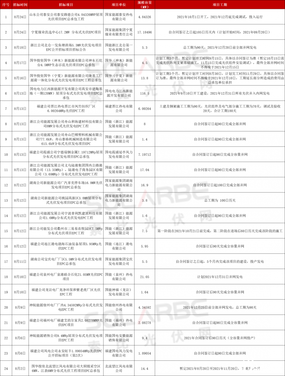 据统计,国家能源集团在8月份发布了24个分布式光伏项目EPC招标,装机容量合计300MW,大多要求年底前并网。