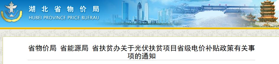 近日,湖北省物价局、省能源局、省扶贫办下达《关于光伏扶贫项目省级电价补贴政策有关事项的通知》。