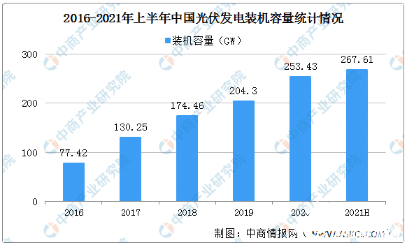 光伏发电装机容量指光伏发电功率的总和。数据显示,2020年我国光伏发电装机容量达253.43GW,2021年上半年我国光伏发电装机容量达267.61GW,同比增长23.7%。