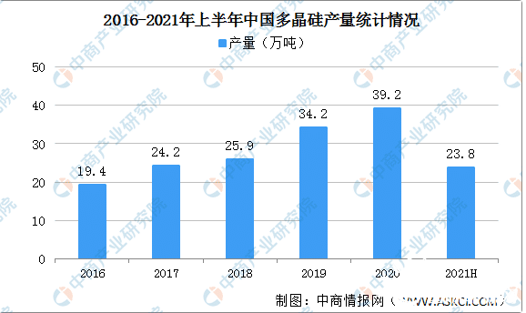 多晶硅方面,2020年,全国多晶硅产量达39.2万吨,同比增长14.6%。其中,排名前五企业产量占国内多晶硅总产量87.5%,其中4家企业产量超过5万吨。上半年全国多晶硅产量分别达到23.8万吨,同比增长16.1%。