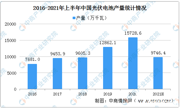 光伏电池用于把太阳的光能直接转化为电能,按电池材料种类不同,可大致分为晶体硅电池和薄膜太阳电池。近年来,我国光伏电池产量持续增长。2021年上半年我国光伏电池产量达9746.4万千瓦,同比增长52.6%。
