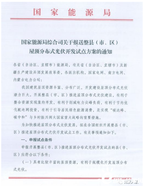 《关于报送整县( 市、区) 屋顶分布式光伏开发试点方案的通知》
