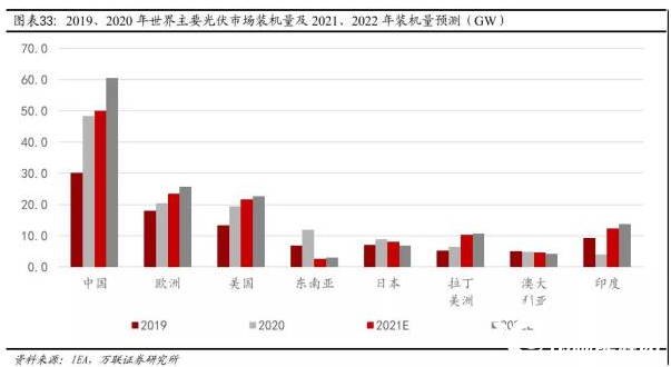 2020年,中国光伏累计装机量253吉瓦,美国只有93.2吉瓦。未来几年,预计中国每年的新增装机量,也都是美国2-3倍。