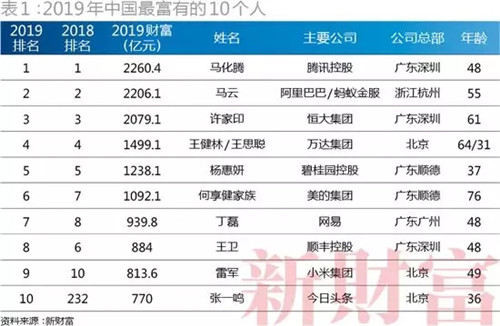 近日,2019新财富500富人榜(名单)揭晓。腾讯控股马化腾、阿里巴巴马云、恒大集团许家印、王健林/王思聪、碧桂园控股杨惠妍分别以2260.4亿元、2206.1亿元、2079.1亿元、1499.1亿元和1238.1亿元财富位列前五。