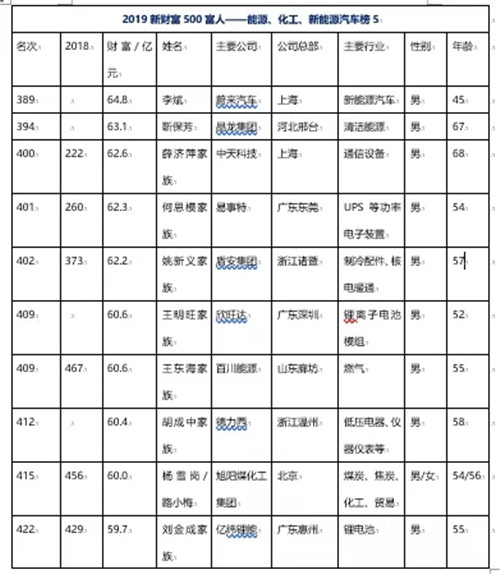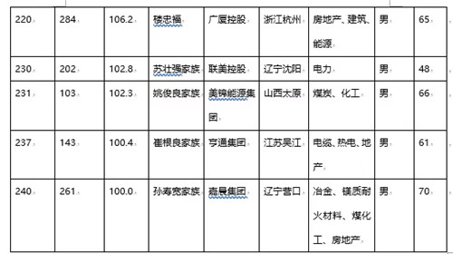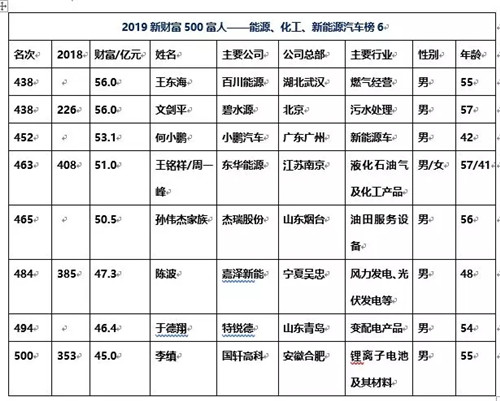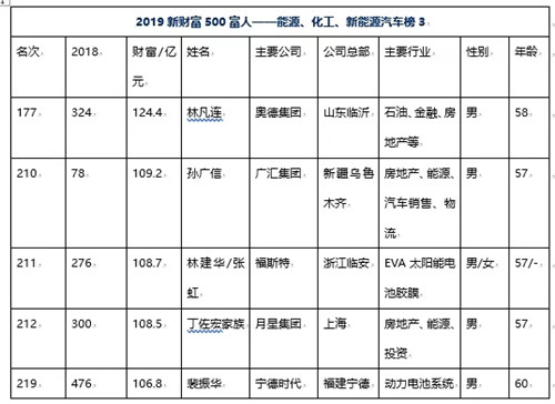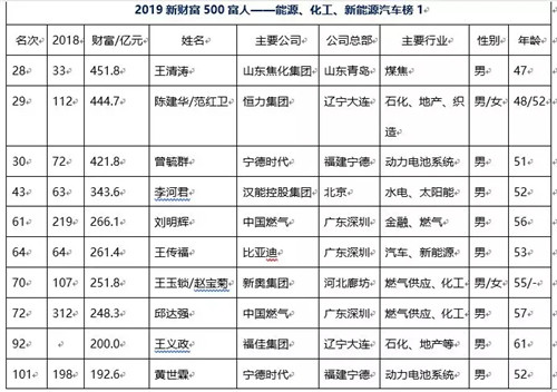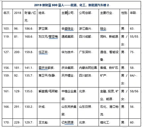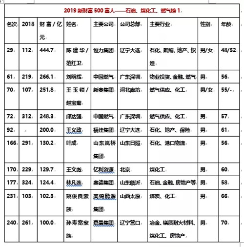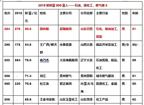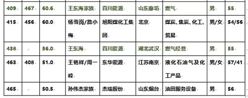 此外,上榜的大佬还有中国燃气邱达强、福佳集团王义政、山东岚桥集团叶成、亿利资源王文彪、奥德集团林凡连、美锦能源集团姚俊良、嘉晨集团孙寿宽、晨曦集团邵仲毅、永泰能源王广西/郭天舒、大连海昌集团曲乃杰、贵州燃气刘江、君正集团杜江涛、山东玉皇化工王金书家族、百川能源王东海家族、旭阳煤化工集团杨雪岗/路小梅、百川能源王东海、东华能源王铭祥/周一峰、杰瑞股份孙伟杰家族。