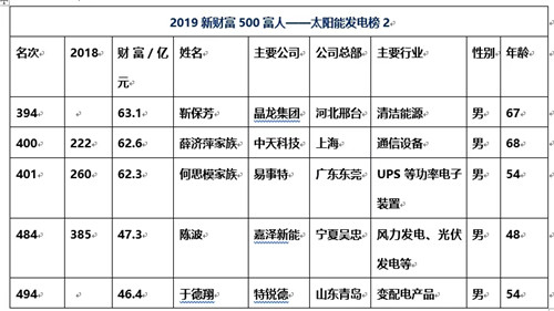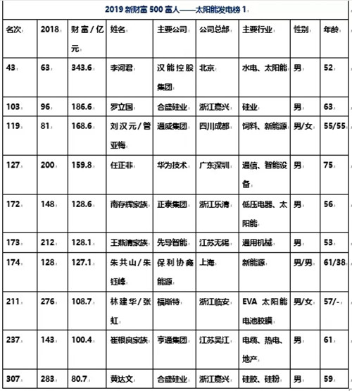 据不完全统计,在太阳能发电领域,入围500人名单的大佬有15位,分别为汉能控股集团李河君、合盛硅业罗立国、通威集团刘汉元/管亚梅、华为技术任正非、正泰集团南存辉家族、先导智能王燕清家族、保利协鑫能源朱共山/朱钰峰、福斯特林建华/张虹、亨通集团崔根良家族、合盛硅业黄达文、晶龙集团靳保芳、中天科技薛济萍家族、易事特何思模家族、嘉泽新能陈波和特锐德于德翔,其财富值分别为343.6亿元、186.6亿元、168.6亿元、159.8亿元、128.6亿元、128.1亿元、127.1亿元、108.7亿元、100.4亿元、80.7亿元、63.1亿元、62.6亿元、62.3亿元、47.3亿元和46.4亿元。