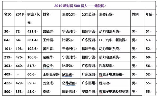 在资源、资金相对密集的能源、化工、环保领域,仍有59位大佬成功入围500人榜。其中,山东焦化集团王清涛、恒力集团陈建华/范红卫、宁德时代曾毓群、汉能控股集团李河君、中国燃气刘明辉分别以451.8亿元、444.7亿元、421.8亿元、343.6亿元、266.1亿元的财富排名前五。