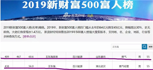注意,名单上二次出现“百川能源王东海”不是笔误,这是据完整榜单统计得来的数据,且百川能源王东海家族与百川能源王东海是两个不同的说法,而且财富值也不有所不同,公司总部所在地分别为山东廊坊和湖北武汉。