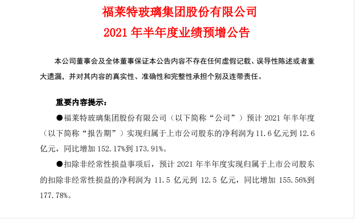 7月9日,福莱特玻璃集团股份有限公司(以下简称“福莱特”)发布2021年半年度业绩预增公告。
