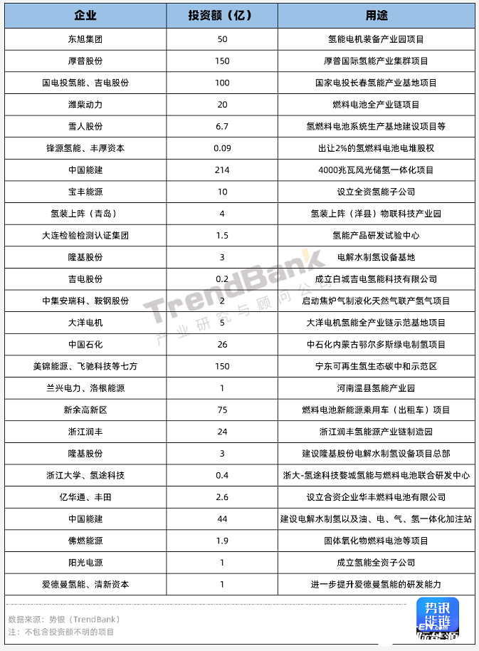 投资企业:中国能建项目投资最多,隆基、阳光跨界布局氢能项目
