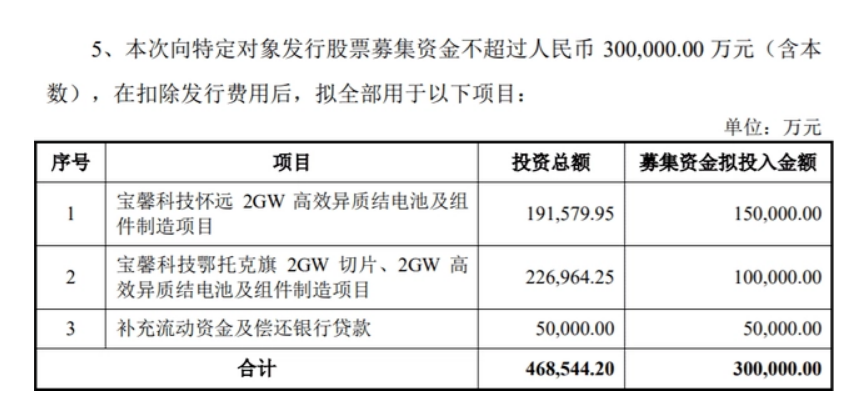 据悉,本次向特定对象发行股票募集资金不超过30亿元(含),在扣除发行费用后,拟全部用于宝馨科技怀远2GW高效异质结电池及组件制造项目、宝馨科技鄂托克旗2GW切片、2GW高效异质结电池及组件制造项目、补充流动资金及偿还银行贷款。