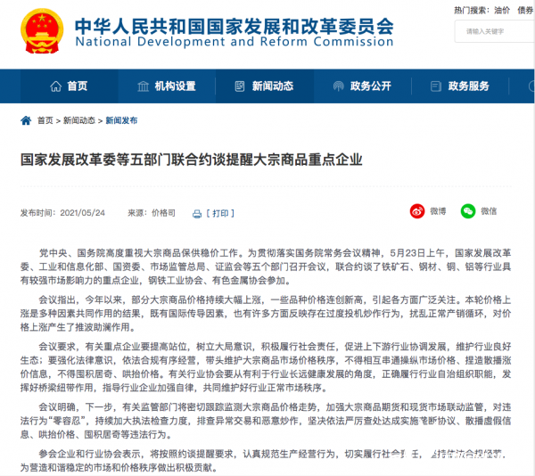 5月23日上午,国家发展改革委、工业和信息化部、国资委、市场监管总局、证监会等五个部门召开会议,联合约谈了铁矿石、钢材、铜、铝等行业具有较强市场影响力的重点企业,钢铁工业协会、有色金属协会参加。而光伏行业涨价最为凶猛的硅料环节其主要参与协会为有色金属协会下属的硅业分会。
