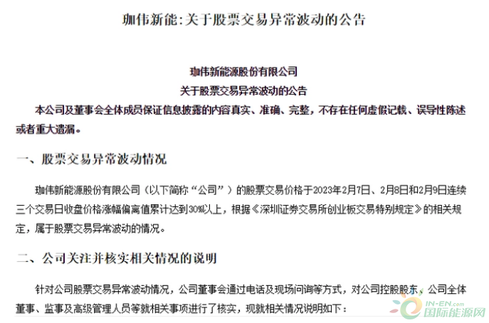 2月9日,珈伟新能发布了关于股票交易异常波动的公告。根据公司发展规划,公司后续会集中资源深耕光伏行业,不再将锂电池生产作为未来发展方向,公司相关的锂电池制造已经停产,已不具备研发、生产锂电池的相关条件,公司开发光伏电站及工商业储能项目所需的锂电池,也将通过集中外采的方式进行。