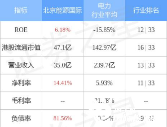 北京能源国际港股市值 47.1 亿港元,在电力行业中排名第 16。主要指标见下表: