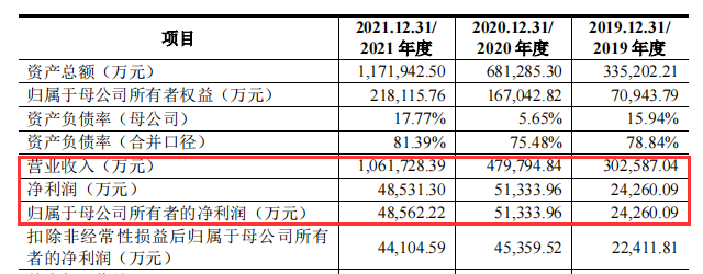 根据财报数据显示,在2019-2021年,润阳股份实现营收分别为30.26亿元、47.98亿元和106.17亿元,实现归母净利润分别为2.43亿元、5.13亿元和4.86亿元;同期,该公司太阳能电池片业务占总营收的比例均超过99%,为营收和利润的最大来源。