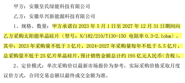 具体来看,皇氏绿能承诺自2023年5月1日至2027年12月31日期间向阜兴科技采购太阳能单晶硅片(型号:N/182/210/T130-150电阻率0.3-2.1ohm),其中:2023年采购量不低于3亿片,2024-2027年采购量每年不低于5.5亿片。