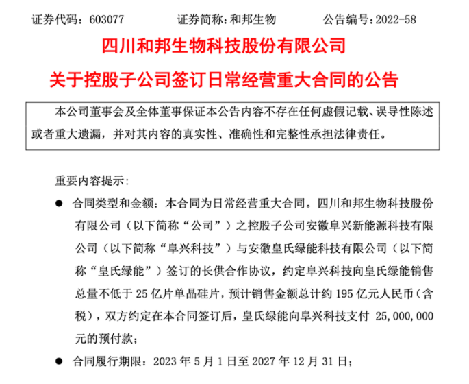 11月1日晚间,和邦生物发布公告称,公司之控股子公司安徽阜兴新能源科技有限公司(下称“阜兴科技”)与安徽皇氏绿能科技有限公司(下称“皇氏绿能”)签订的长供合作协议,约定阜兴科技向皇氏绿能销售总量不低于25亿片单晶硅片,预计销售金额总计约195亿元人民币(含税)。