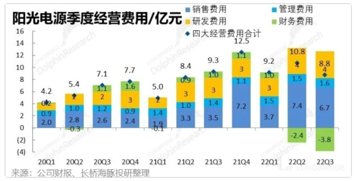 从下图可见,在营收绝对值创新高,毛利也环比改善的同时,公司的主要经营费用从费用率角度都有所改善。详细来看,销售、管理、研发费用率分别较上季环比减少了2.9/0.4/1.1pct。其中,对注重品牌和渠道效应的逆变器公司最重要的营销费用,本季支出的绝对值也环比减少了0.7亿到6.7亿元。