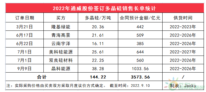 实际上,通威股份今年以来已经签订了6笔百亿级以上硅料大单,其先后与隆基绿能等6家头部企业签订的合同预计金额总计超3570亿元,供应硅料总计超过144万吨。