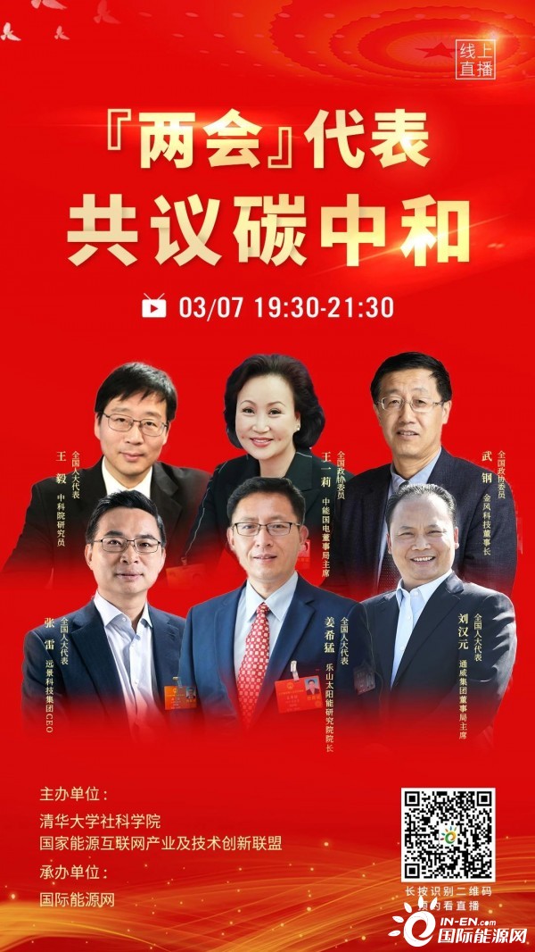 为明晰我国能源“碳中和”规划目标如何确定,同时也为贯彻我国低碳发展的长期目标的实现,由清华大学能源转型与社会发展研究中心和国家能源互联网产业及技术创新联盟联合主办、国际能源网承办的一场题为“两会代表共议碳中和”的线上研讨会,将于3月7日19:30-21:30在线举行。届时全国人大常委王毅,人大代表刘汉元、张雷、姜希猛,政协委员武钢、王一莉,以及来自清华大学、国家气候战略中心和国家发改委能源所的专家,共同探讨“中国如何实现2030碳达峰,2060碳中和的愿景”等话题。
