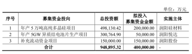 此次募集资金的用途中,润阳股份将一半用于在宁夏回族自治区石嘴山市建设年产5万吨高纯多晶硅项目,该项目总投资金额为49.81亿元,拟投入募集资金20亿元。