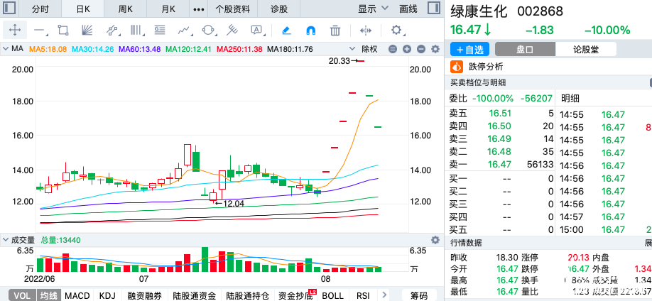“绿康生化”是一只默默无闻的股票,最近两个星期却引发了市场关注,因为上周突然连续5个涨停板,股价大涨61%,成为A股周涨幅第二的股票,但是8日股价开盘跌停,直至收盘一直被摁在跌停板上,今日又是开盘即跌停,到收盘都没有打开过。