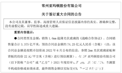 对此,亚玛顿解释称,报告期,随着硅料及大宗商品价格大幅上涨以及光伏玻璃产能快速扩张,二季度开始,光伏玻璃价格大幅下降并在低位波动,因此,合同总金额与实际履行金额存在较大差异。