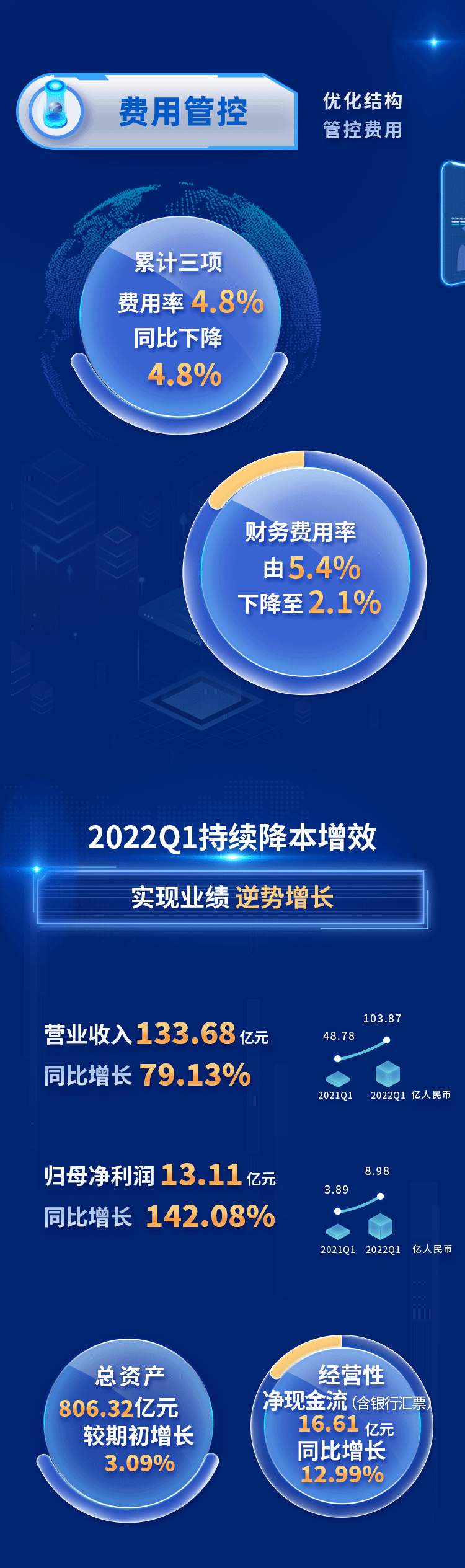 4月26日晚间披露一季报,一季度实现营业收入133.68亿元,同比增长79.13%;净利润13.11亿元,同比增长142.08%;基本每股收益0.41元。