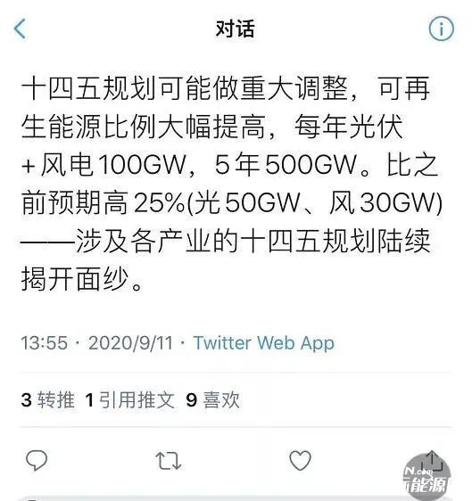 之前有消息称:十四五规划可能做重大调整,可再生能源比例大幅提高,每年光伏+风电100GW,5年500GW,超出此前预期25%。