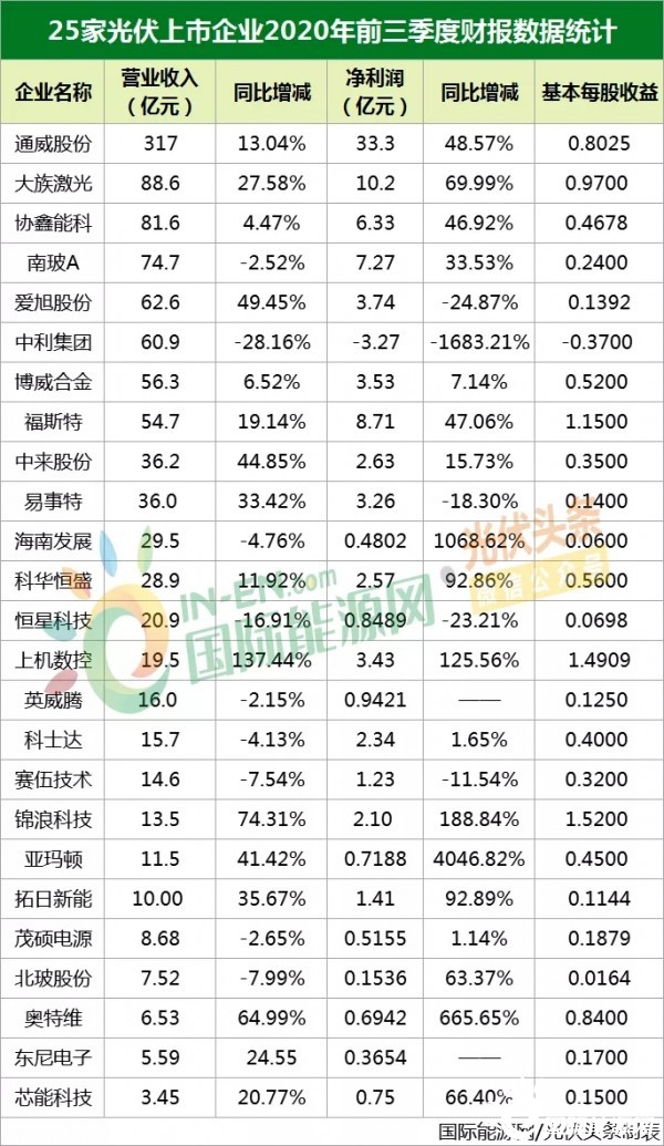据国际能源网/光伏头条不完全统计,截止10月27日,已有25家光伏企业披露了2020年前三季度业绩报告。