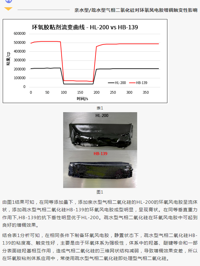 通过比较亲水型气相二氧化硅HL-200与该亲水型处理后得到的疏水型气相二氧化硅HB-139增稠触变性。实验结果表明,气相二氧化硅作为无机增稠剂能有效提升环氧叶片胶的粘性和触变性,疏水性产品增稠效果和触变性更佳。通过考察HB-139与市场销售的竞品A、竞品B增稠触变性以及力学性能包括拉伸强度、断裂伸长率、剪切强度、剥离强度等性能指标和时间参数、添加量对双组份环氧风能叶片胶的影响。结果发现,HB-139与市售竞品的增稠触变性、抗下垂性、力学性能相当。