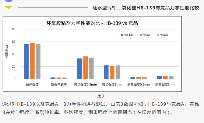结论:气相二氧化硅在环氧风电叶片胶中可作为增稠触变剂,能有效增加叶片胶的粘性、稠度,提升垂直面的施工的便利性,可减少胶料无控制流动。在适量添加量下,疏水型气相二氧化硅增稠触变性好于亲水型。在提升胶料产品性能方面,国产疏水型气相二氧化硅HB-139在环氧风电胶力学补强、粘接强度提升、抗下垂性上,与竞品比较具有较强的竞争力。