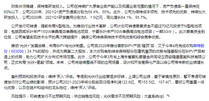 盈利预测和投资评级:维持“买入”评级。考虑到光伏行业经营逐步好转,上调公司业绩,基于审慎性原则,暂不考虑可转债发行对公司业绩的影响,预计公司2021-2023年将分别实现归母净利润122.6亿、司155.5亿、187.4亿,看好公司垂直一体化优势,以及在硅片和组件的龙头地位,维持“买入”评级。