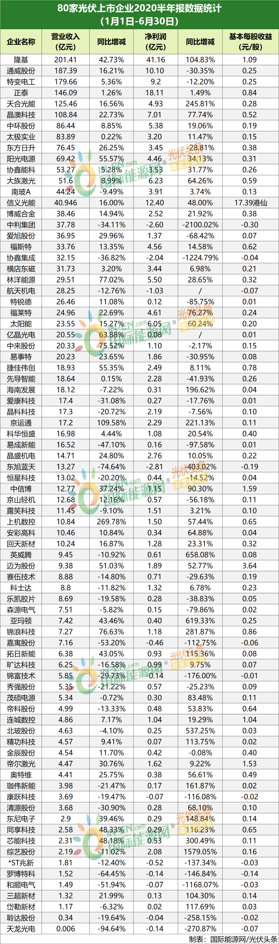 从2020年上半年光伏上市企业的净利润榜单来看,80家光伏企业的净利润合计为192.2亿;