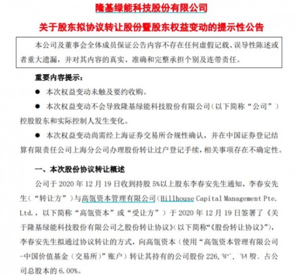 12月20日,隆基股份发布公告称,公司持股5%以上股东李春安与高瓴资本签署股份转让协议,李春安拟向高瓴资本转让其持有的6%公司股份。公告显示,交易双方一致同意,本次交易的每股转让价格为70元,本次交易对价总额约为158.41亿元。隆基股份最新收盘价为77.65元/股,本次交易的转让价格较其股价折价9.85%。交易完成后,高瓴资本将持有隆基股份6%的股权,成为第二大股东。