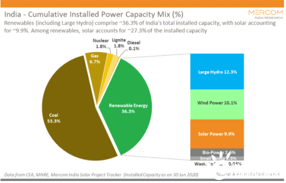 <span style="font-family: -apple-system-font, BlinkMacSystemFont, "Helvetica Neue", "PingFang SC", "Hiragino Sans GB", "Microsoft YaHei UI", "Microsoft YaHei", Arial, sans-serif; font-size: 15px; letter-spacing: 1.5px; text-align: justify; background-color: rgb(255, 255, 255);”>根据印度中央能源管理局(CEA)和新能源和可再生能源部(MNRE)数据显示,2020年二季度,印度可再生能源(包括大型水电项目)市场份额较一季度微升0.1%至36.3%。二季度全国总装机容量从一季度的372.1GW微增至372.9GW。
