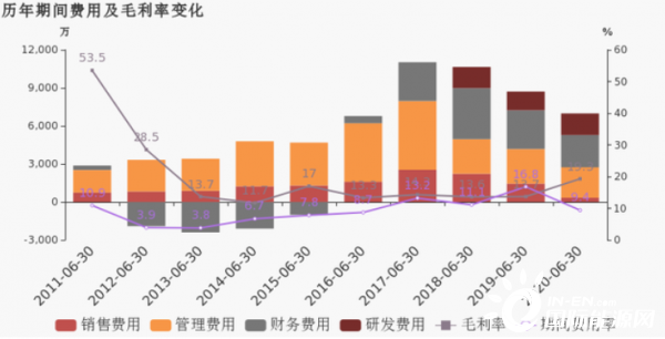 公司2020半年度营业成本6亿,同比增长34.1%,低于营业收入43.5%的增速,导致毛利率上升5.7%。期间费用率为9.4%,较去年下降7.4%,费用管控效果显著。经营性现金流由8738.6万下降至-2200.4万,同比下降125.2%。