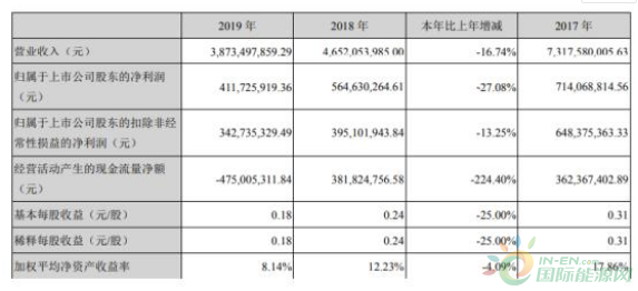 4月11日,易事特(300376)近日发布2019年年度报告,公告显示,报告期内实现营收3,873,497,859.29元,同比下滑16.74%;归属于上市公司股东的净利润411,725,919.36元,同比下滑27.08%;基本每股收益为0.18元,上年同期为0.24元。